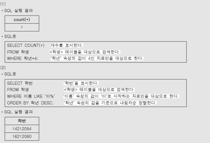 (2) SELECT 학번 FROM 학생 WHERE 이름 LIKE '이%' ORDER BY 학년 DESC;
