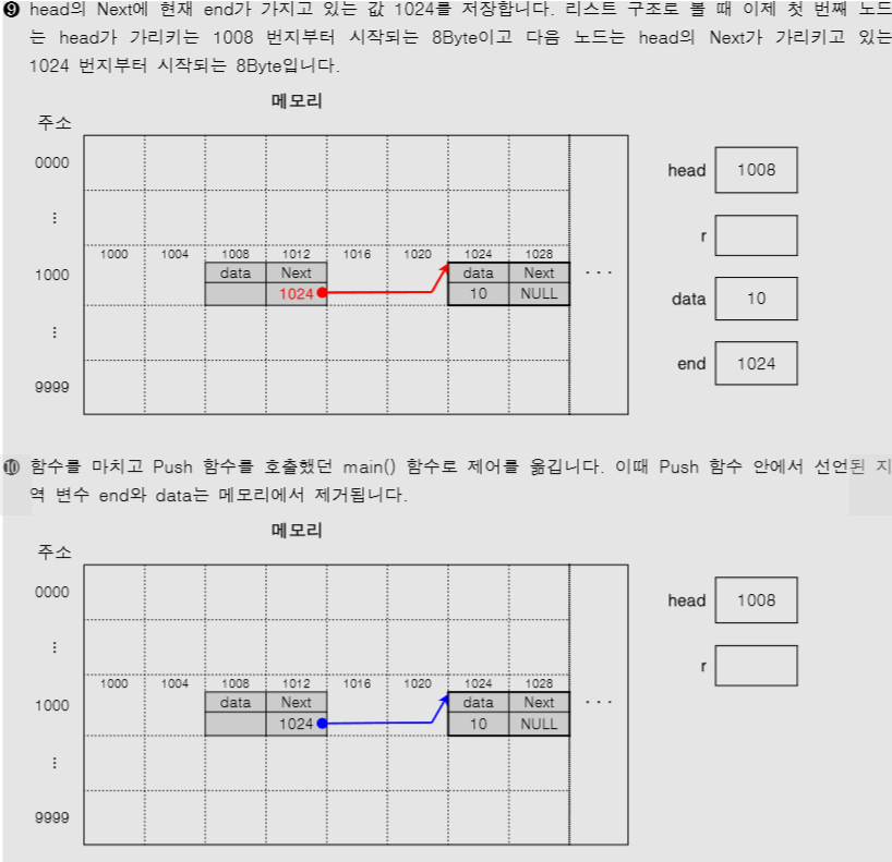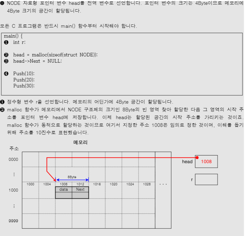 3. 다음은 연결 리스트를 활용하여 스택 구조를 C언어로 구현한 것이다. <출력>과 <코드>를 보고 괄호 ( ① ), ( ② )에 가장 적합한 답을 쓰시오.