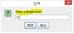 | String bright = JOptionPane.showInputDialog("Enter a Bright level"); DimmingLights moodLamp = new DimmingLight(id+ "moodLamp"); moodLamp.setBright(bright); // 변경할 부분 moodLamp.on(); |