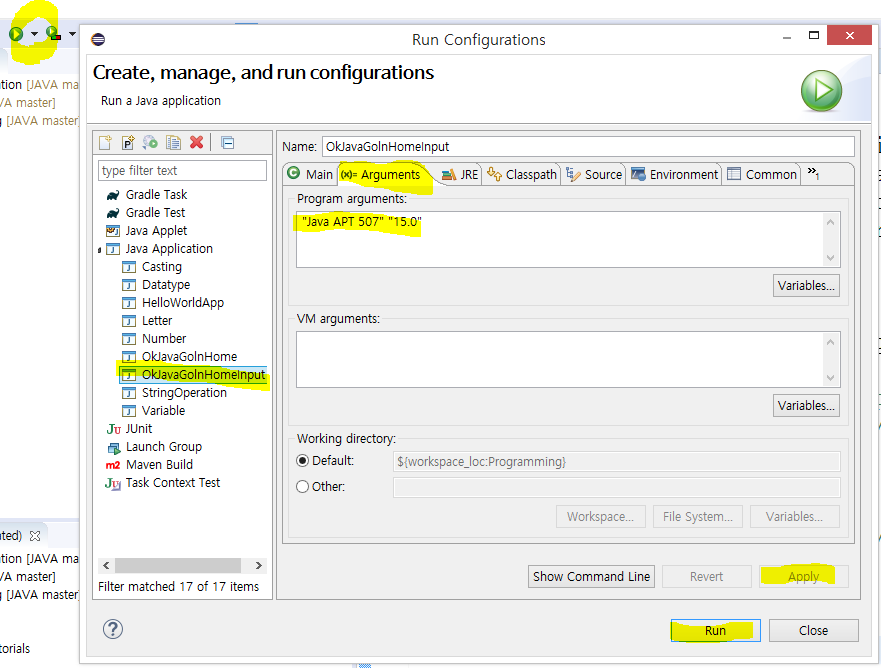 - Program arguments에 내가 자동으로 넣어 줄 값을 차례로 입력한다.