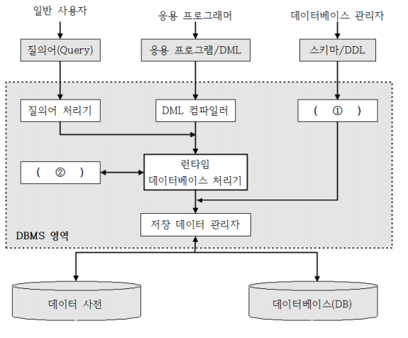 3. 다음 데이터베이스 관리 시스템의 내용을 참고하여 괄호 (①, ②)에 들어갈 알맞은 DBMS 구성 요소 명칭을 작성하시오.