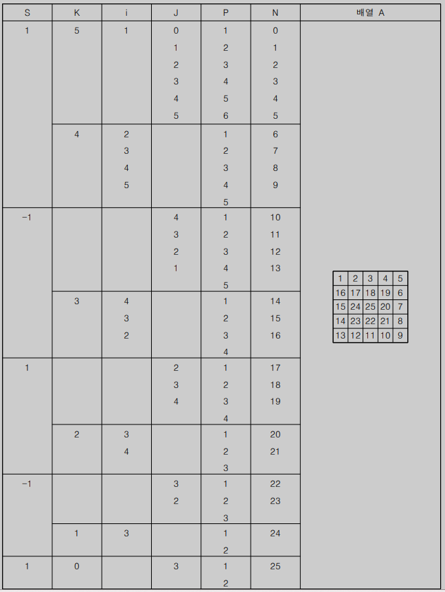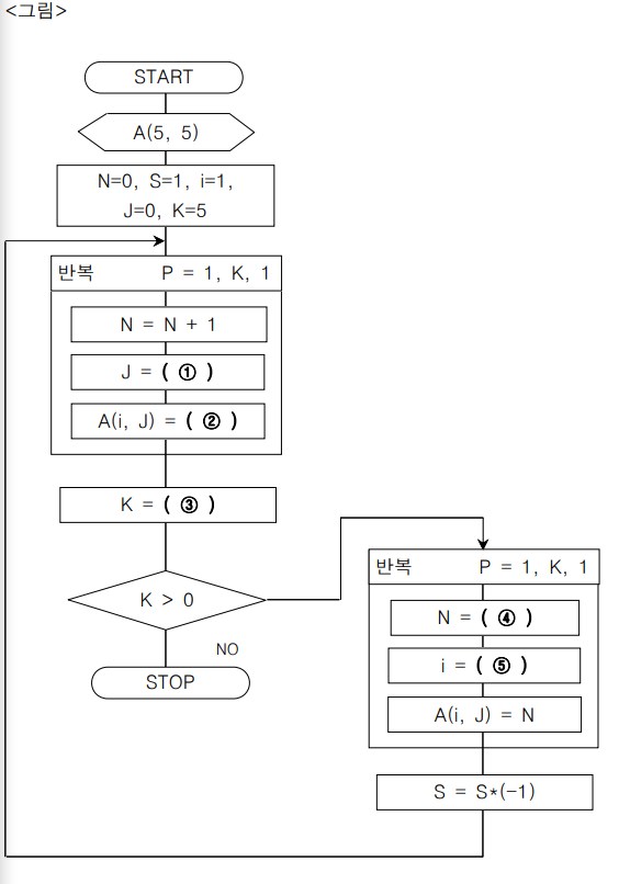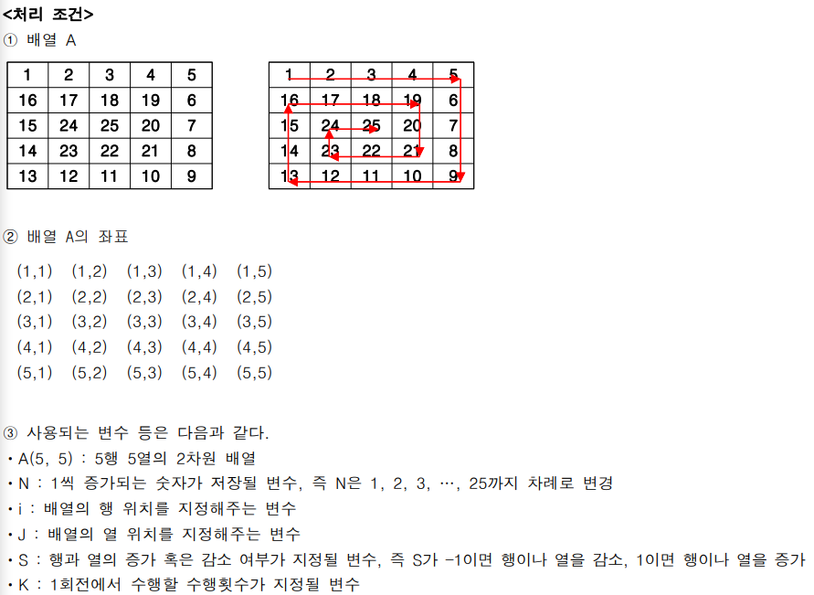 7. 5행 5열의 배열에 <처리 조건> ①번과 같은 과정으로 숫자를 기억시키는 알고리즘을 기술한 것이다. 알고리즘이 <처리 조건>에 따라 가장 효율적으로 구현될 수 있도록 괄호 (①) ~ (⑤)에 해당하는 답을 쓰시오.