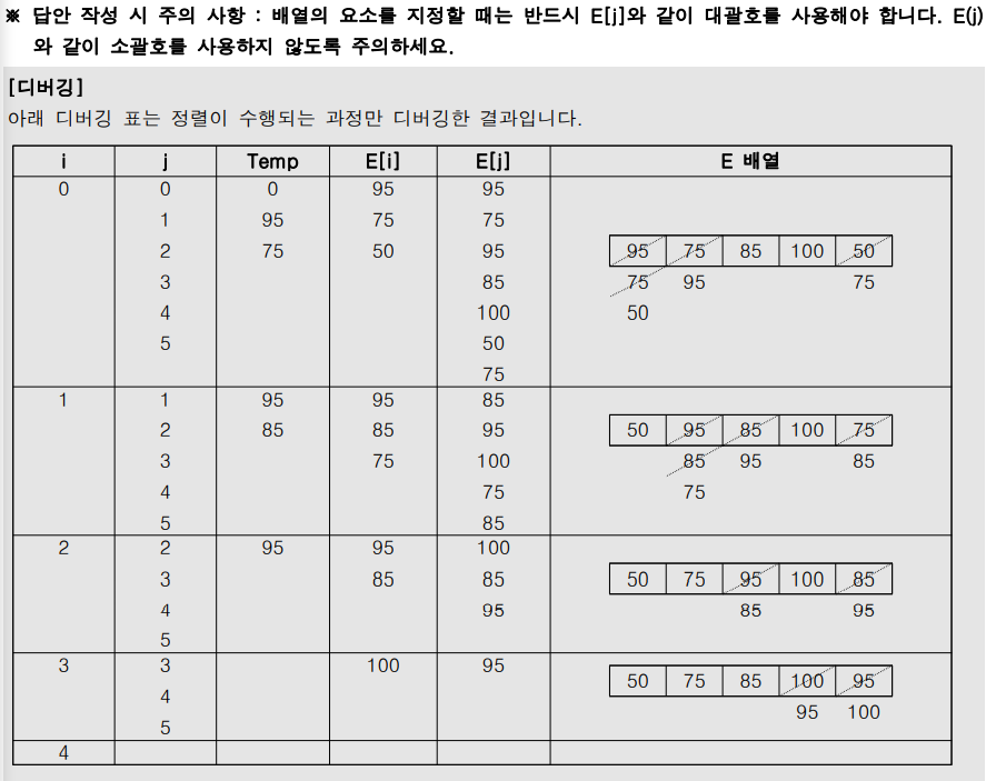 | <처리 조건> 배열에는 95, 75, 85, 100, 50 이 차례대로 저장된다. 배열에 저장된 값을 오름차순으로 정렬하여 출력한다. |