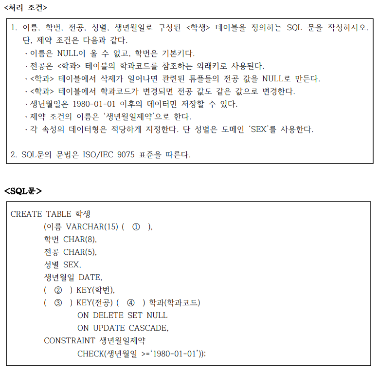 10. 데이터베이스와 관련한 다음 <처리 조건>에 부합하도록 괄호 (①)~(④)를 채워 SQL문을 완성하시오.