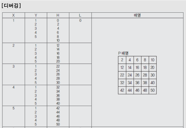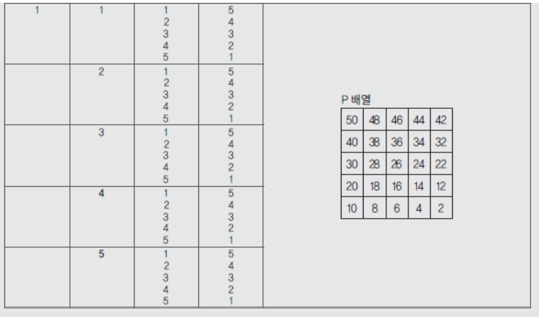 7. 5행 5열의 배열에 P의 값을 저장한 후 <처리 조건> ①번과 같은 과정으로 두 번 90도 회전하여 결과를 다시 배열 P에 이동하는 알고리즘을 기술한 것이다. 알고리즘이 <처리 조건>에 따라 처리될 수 있는 가장 효율적인 알고리즘으로 구현될 수 있도록 괄호 (①), (②), (③)에 해당하는 답안을 각각 <답란>에 쓰시오.