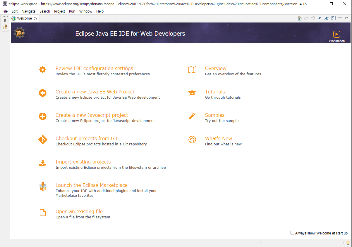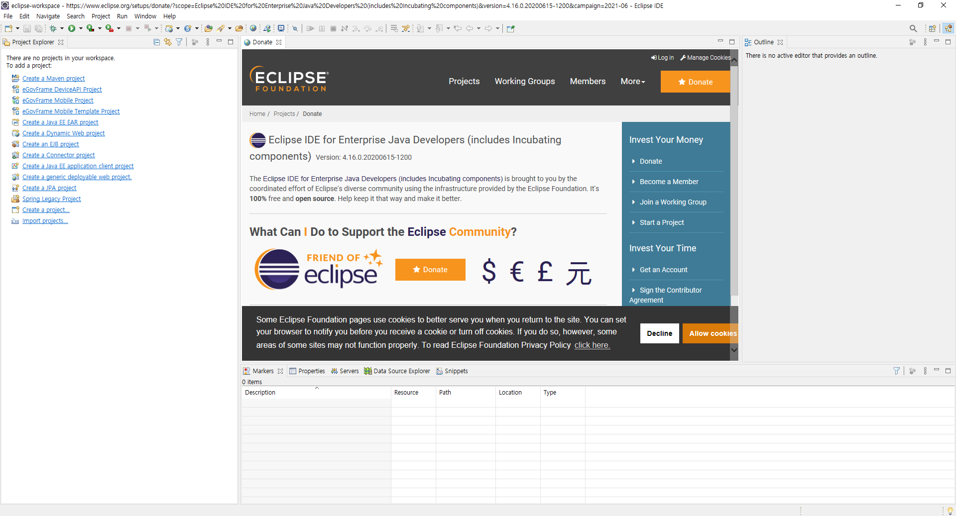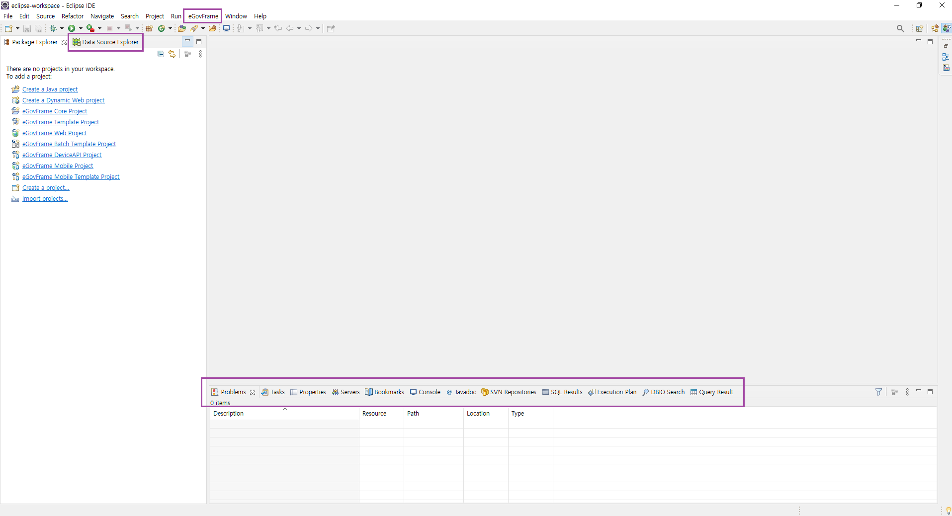 위의 사진과 동일하게 eGovFrame 관련 메뉴가 추가됐으면 정상적으로 개발환경 설치가 완료된 것입니다.