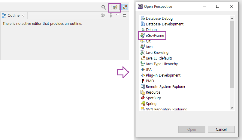 7. eGovFrame 설정하기 ( eclipse 초기화면 우측에 Open Perspective 클릭 )