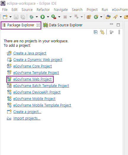 Package Exploer에 아래와 동일하게 뜨지 않는다면, File - New - eGovFrame Web Project로 프로젝트를 생성한다.
