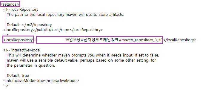 maven_repository_3_10 디렉터리 하위에 settings.xml 파일 넣고 수정한다. ( settings.xml 파일 설치 경로 )- settings.xml을 메모장으로 연결하여 파일을 열면 <settings> 태그 아래 <localRepository>maven_repository_3_10 설치 경로</localRepository> 로 수정한다.