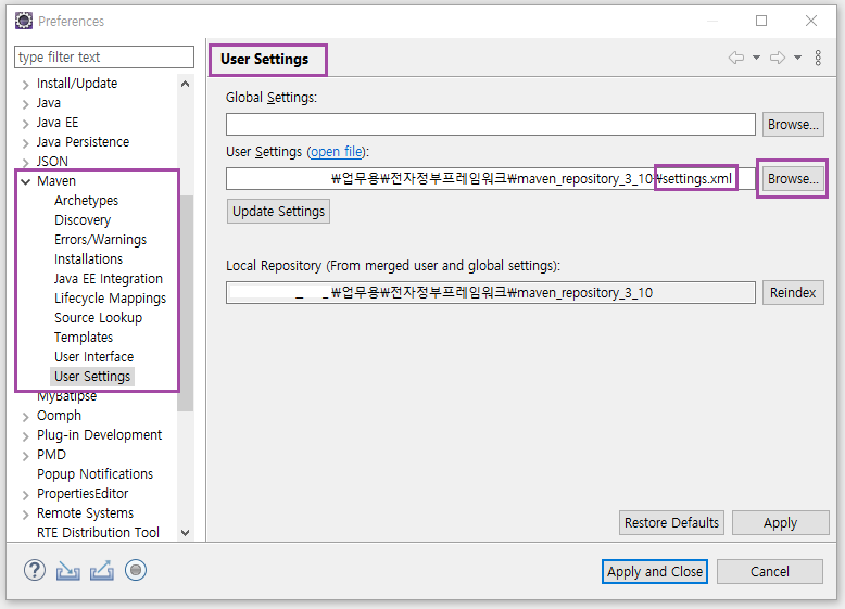 - Maven - User Settings 항목을 [MavenRepository 설치디렉토리]/setting.xml 파일로 지정한다.