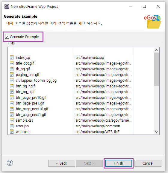 Genereate Example 을 체크한 뒤 Finish를 클릭하면 정상적으로 프로젝트가 생성된다.