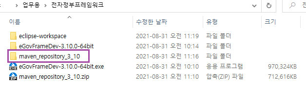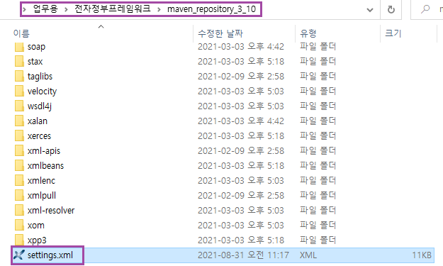 아래는 임의의 디렉터리에 Maven repository 3.10을 압축 해제한 뒤의 모습이다.