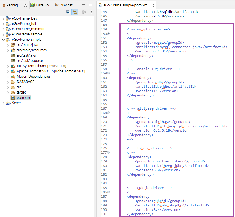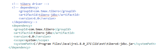 DB에 테이블이 정상적으로 생성되고 데이터까지 셋팅됐다면 pom.xml에서 tibero driver의 의존성을 추가해줘야한다.