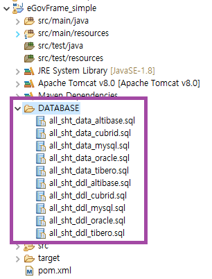 프로젝트가 생성되면 DB에 테이블을 먼저 생성해줘야하며, sql문은 DATABASE 하위에서 제공한다.