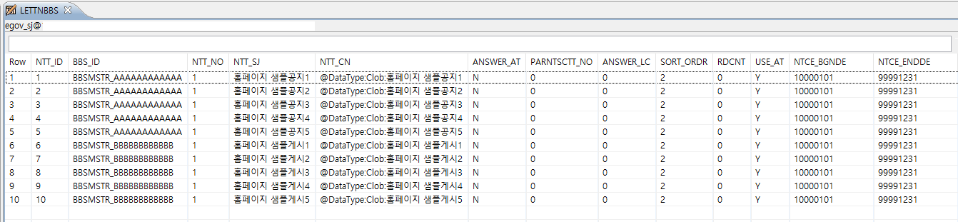 공지사항을 새로 등록하기 전 LETTNBBS 테이블에 등록되어있는 공지사항 데이터는 아래와 같다.