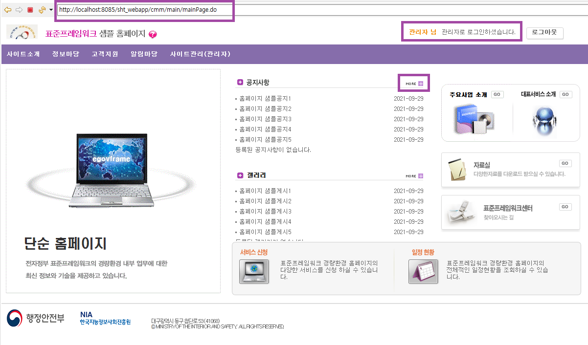 홈페이지를 개발하면서 유심히 봐야할 부분이 접속 url인데,globals.properties에서 MainPage url을 /cmm/main/mainPage.do로 설정해놨기 때문에 접속 시 메인 페이지 url이http://localhost:8085/sht_webapp/cmm/main/mainPage.do 로 뜨는 것이다.이제 공지사항의 MORE를 클릭한다.