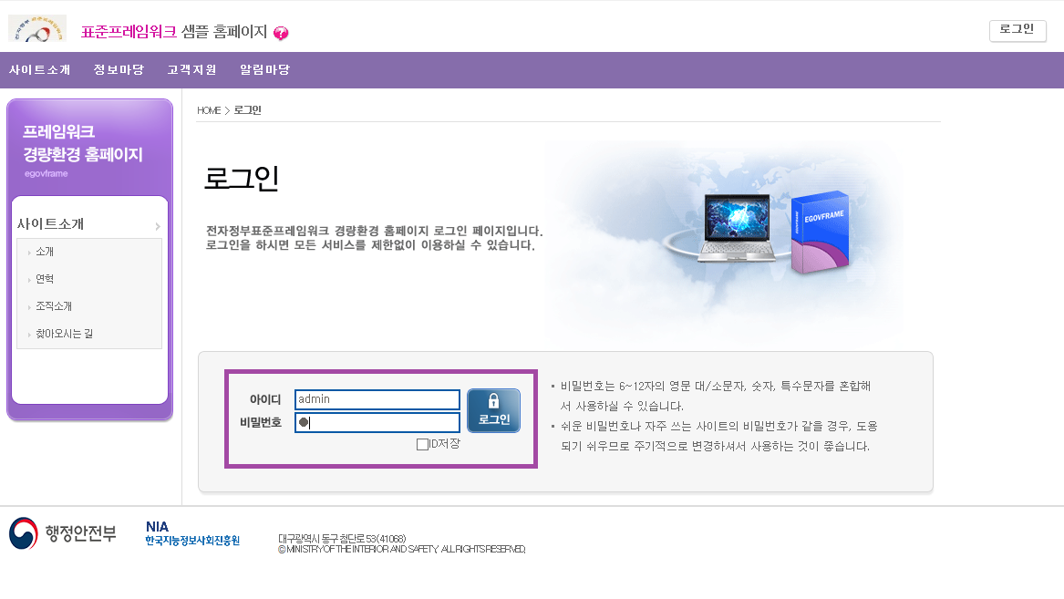 아이디 : admin / 비밀번호 : 1 로 로그인을 하는데 만약, 로그인 정보가 없다는 에러 메시지가 뜬다면