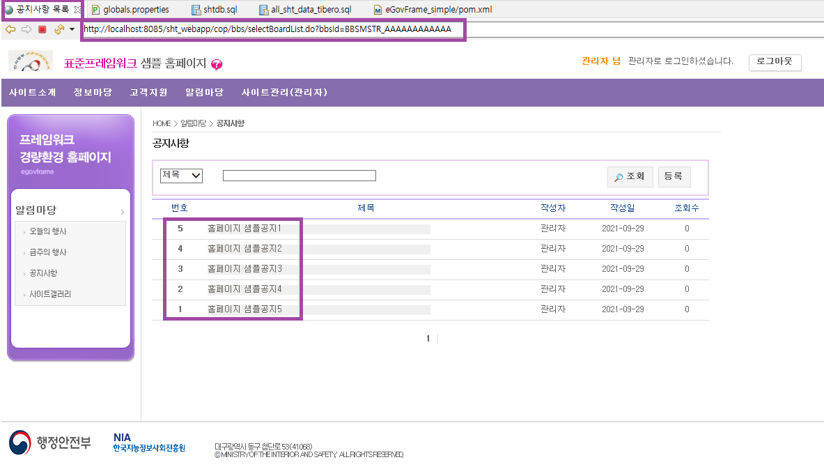 BBS_ID가 BBSMSTR_AAAAAAAAAAAA인 5개의 데이터가 홈페이지 화면에 동일하게 등록되어있는 모습이다.