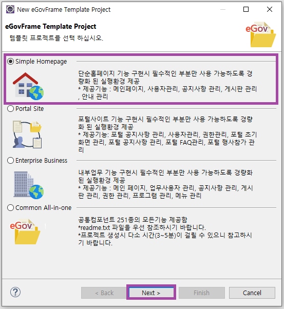 Simple Homepage 를 선택하고 Next를 클릭한다.
