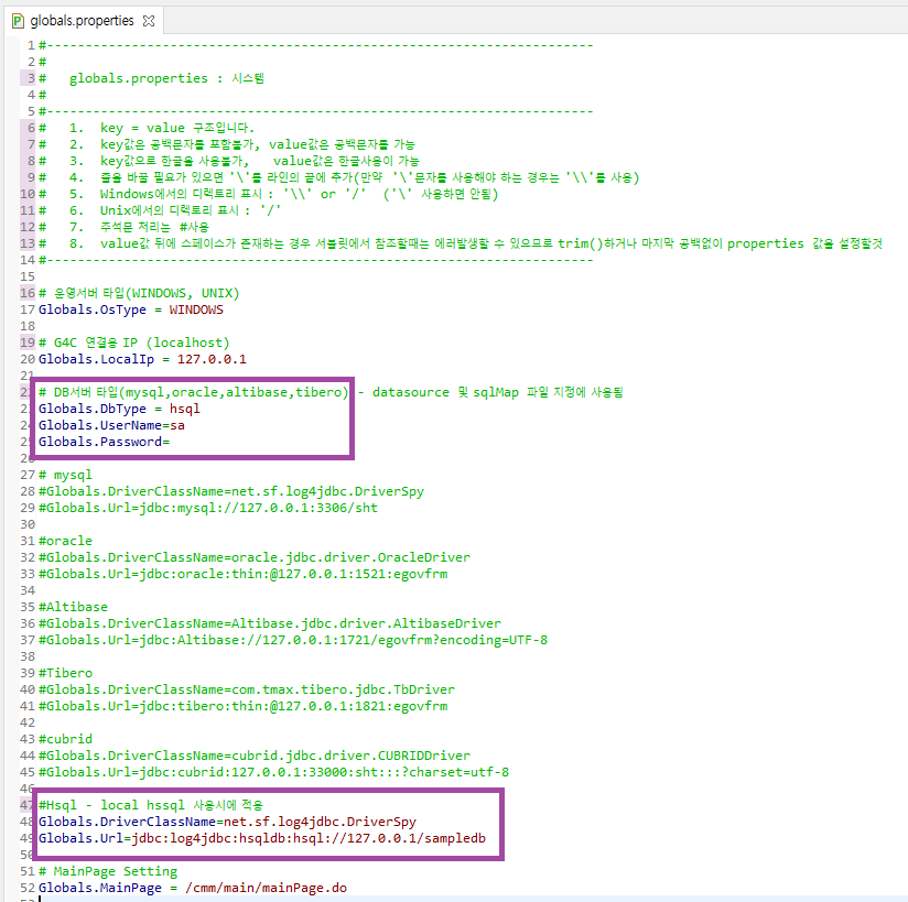 초기 globals.properties는 hsql로 설정되어있기때문에 박스친 부분을 본인 환경에 맞는 db로 변경해준다.