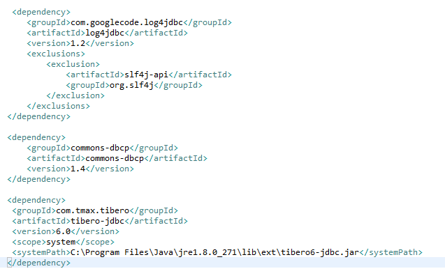 tibero를 사용하기 위해 pom.xml에 의존성을 추가해줘야한다.